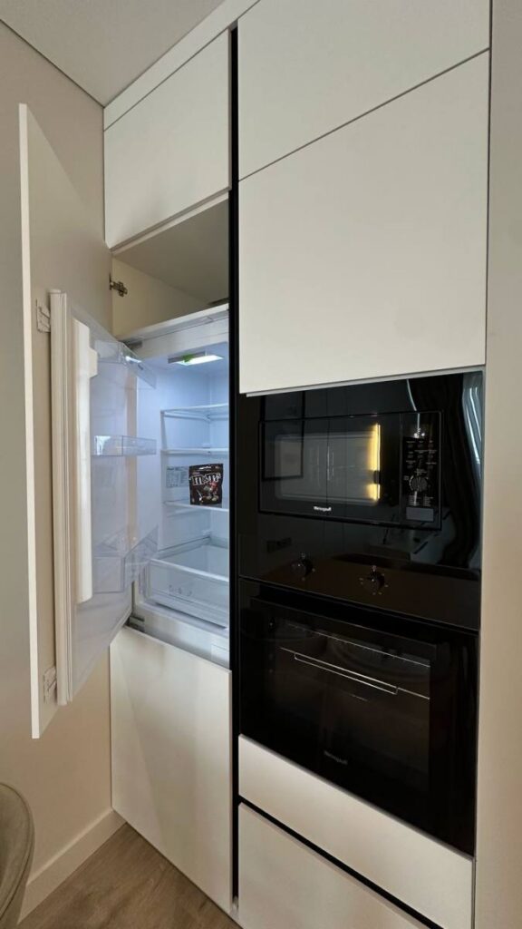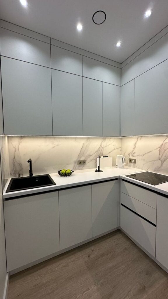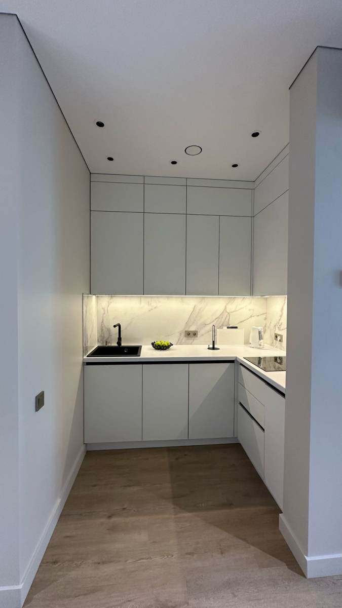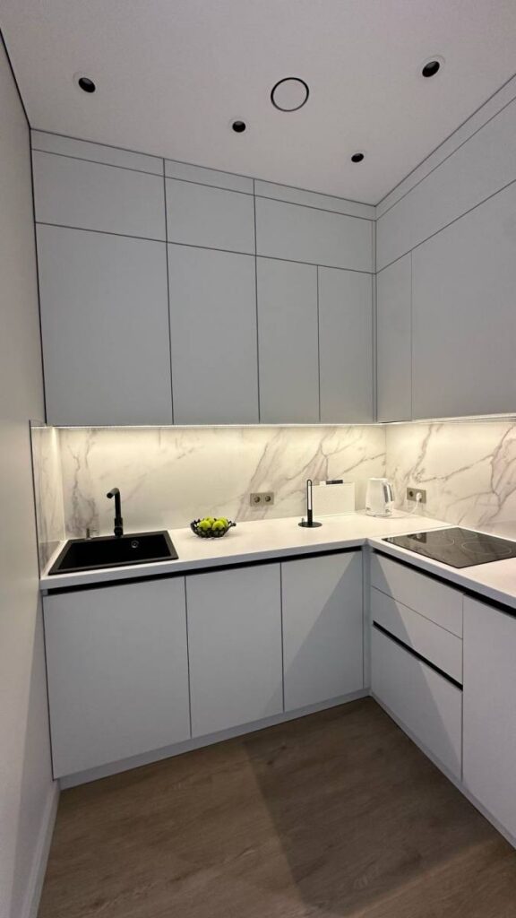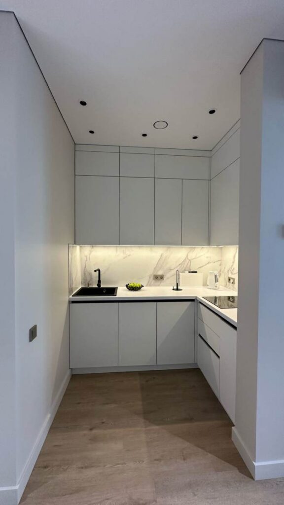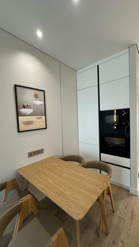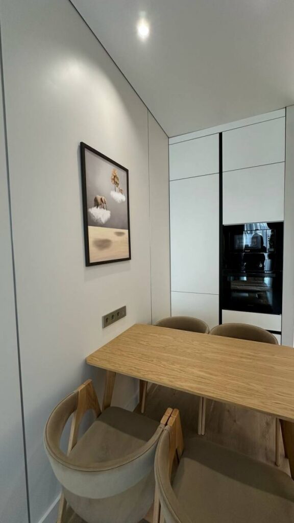 Зона кухни и гостиной оформлена так, чтобы взгляд не упирался в бытовые элементы. Чистые линии, световые акценты, мебель под заказ по размерам и полностью интегрированная техника создают ощущение лёгкости и порядка.