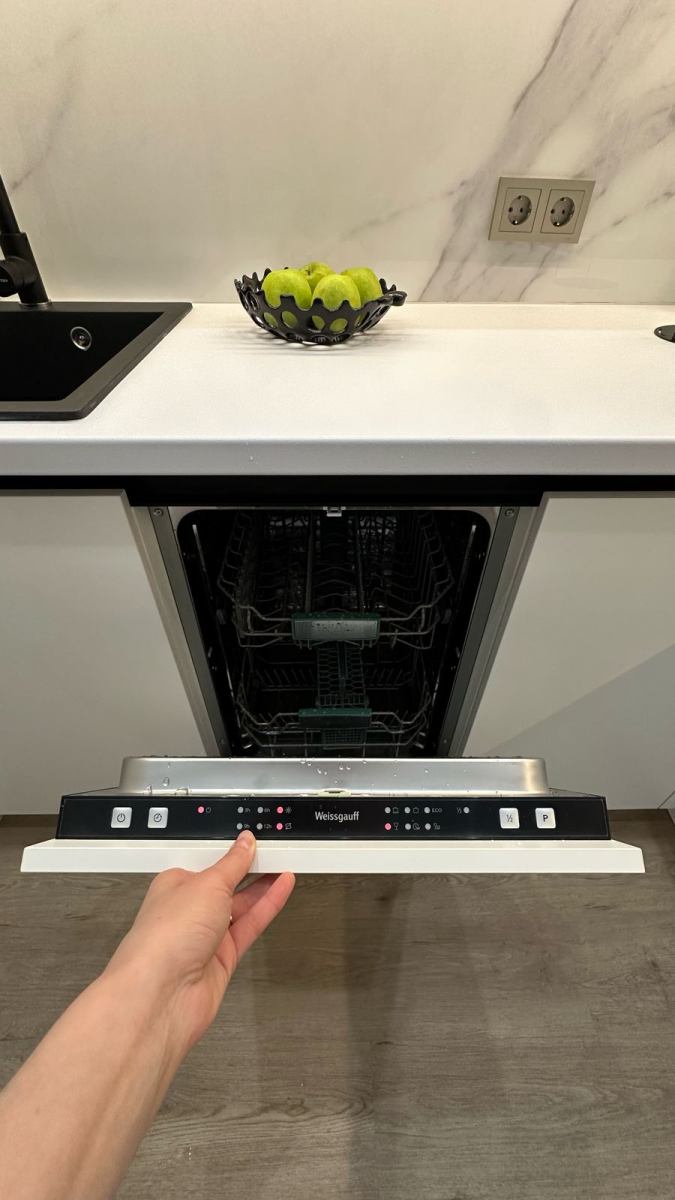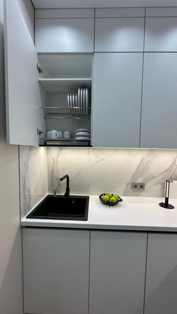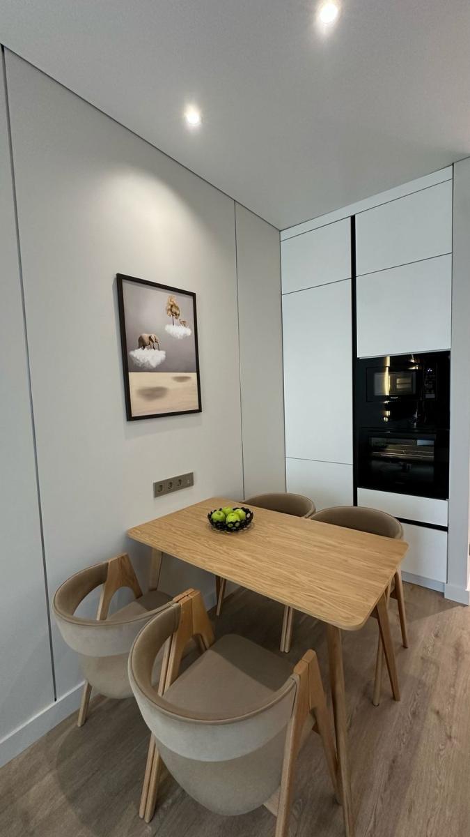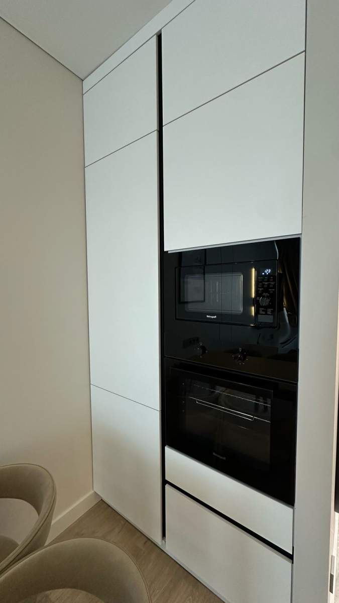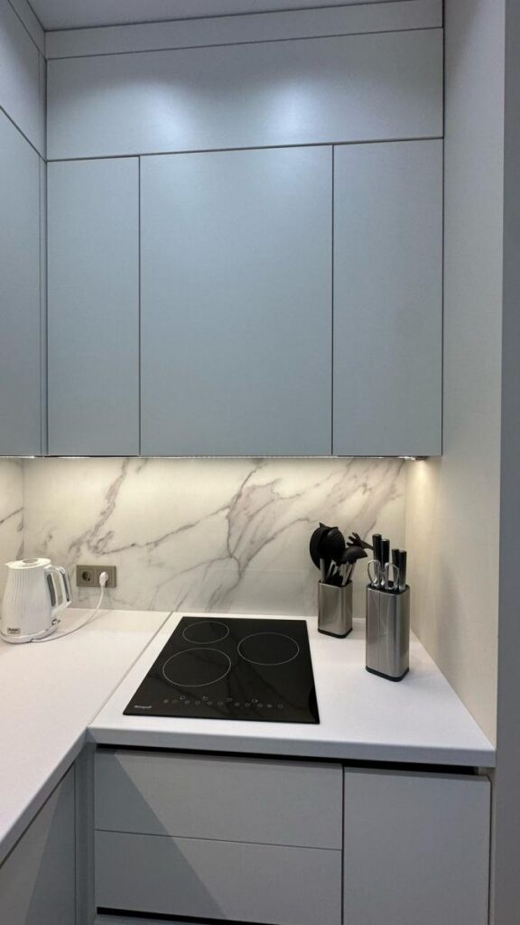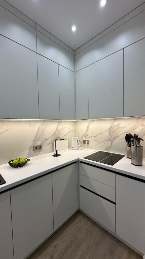 Зона кухни и гостиной оформлена так, чтобы взгляд не упирался в бытовые элементы. Чистые линии, световые акценты, мебель под заказ по размерам и полностью интегрированная техника создают ощущение лёгкости и порядка.