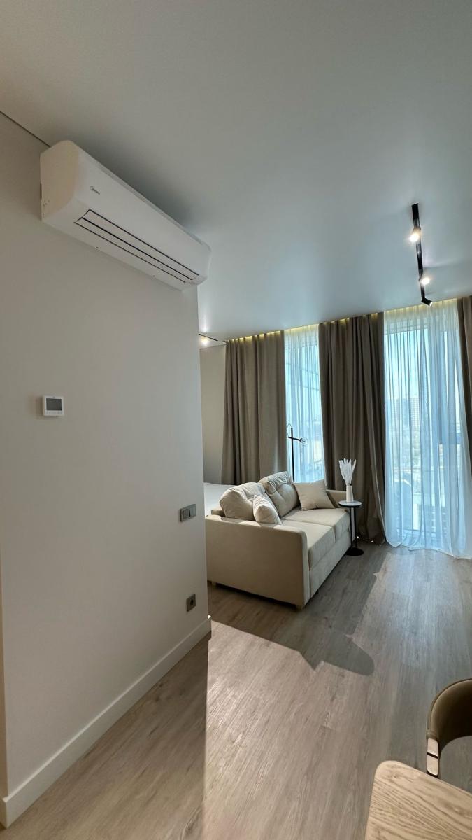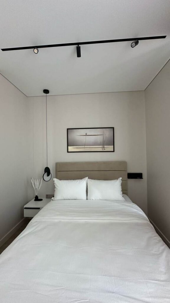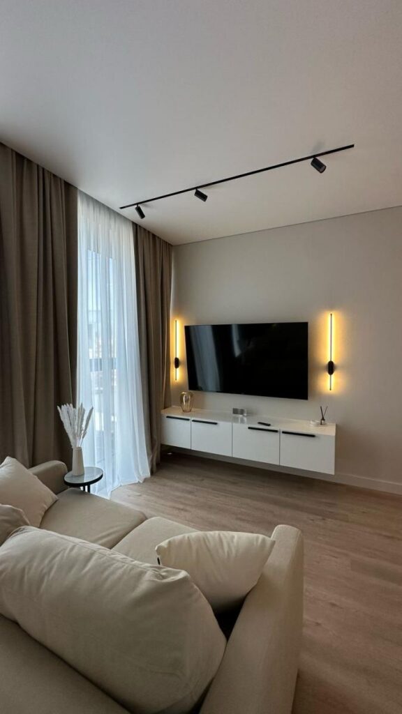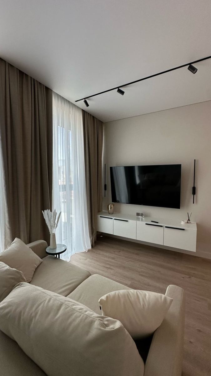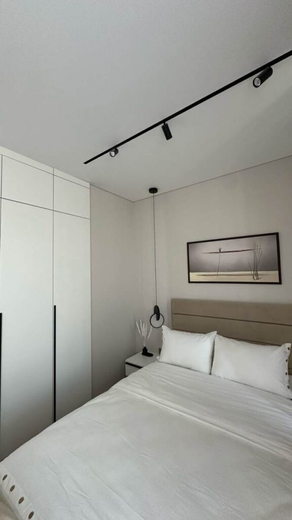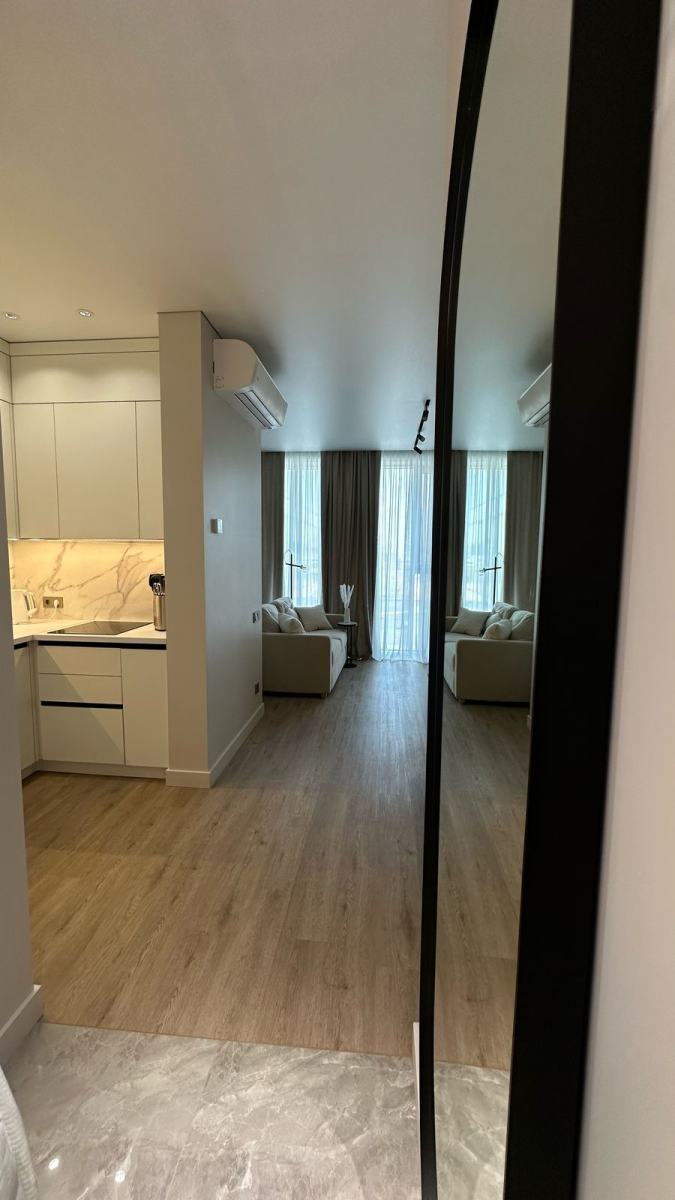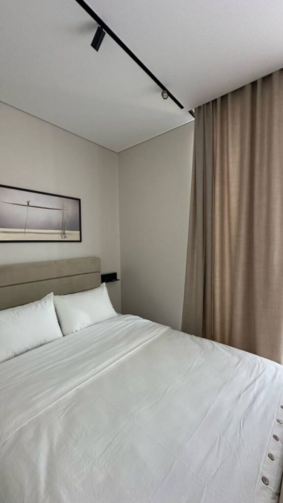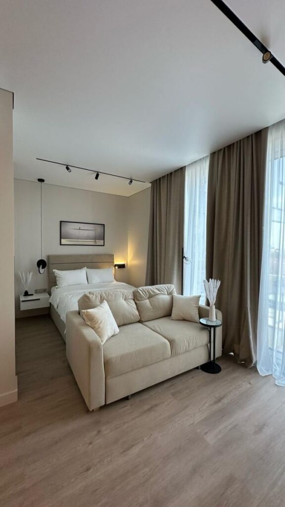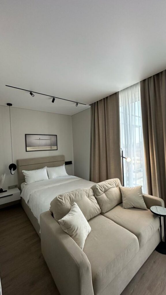 В таких локациях апартаменты в бетоне — как дорогая страница, ожидающая правильного автора. Владелец студии площадью 35,7 м² поручил нам создать пространство, соответствующее уровню 5* отеля: функциональное, технологичное, тихое, стильное и полностью готовое к аренде или личному проживанию.