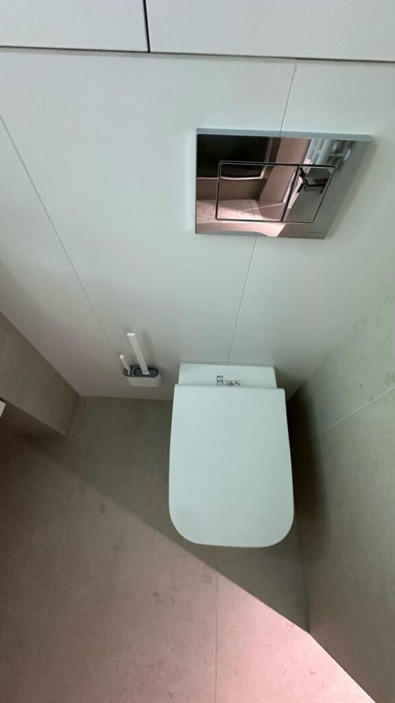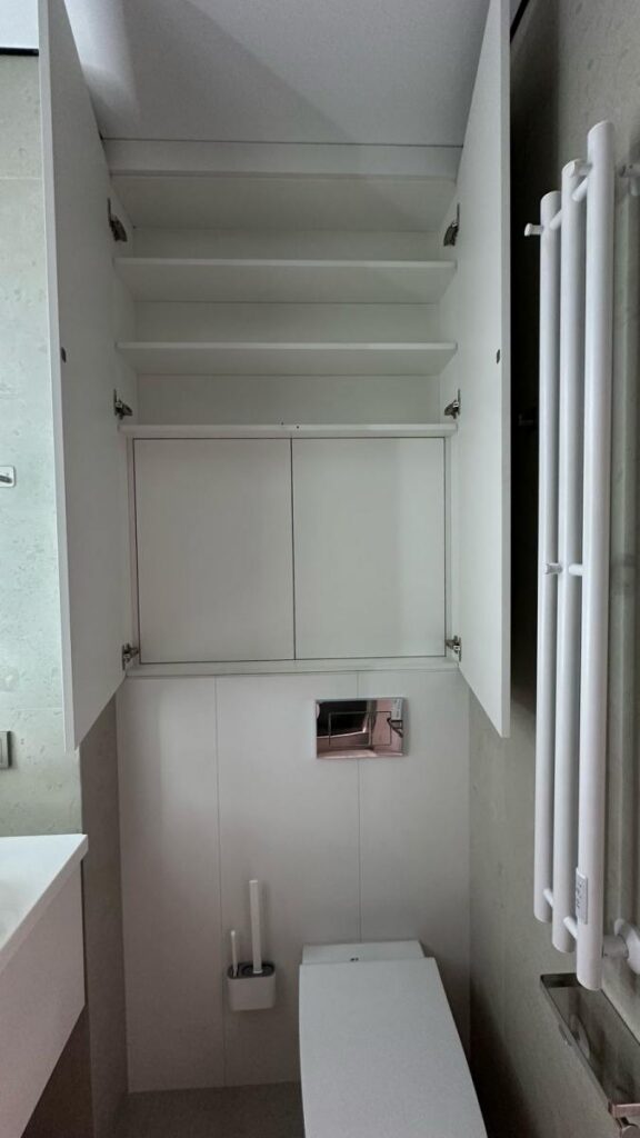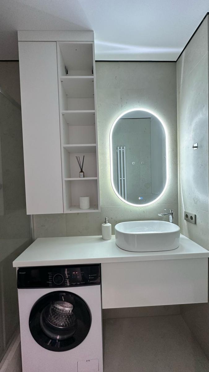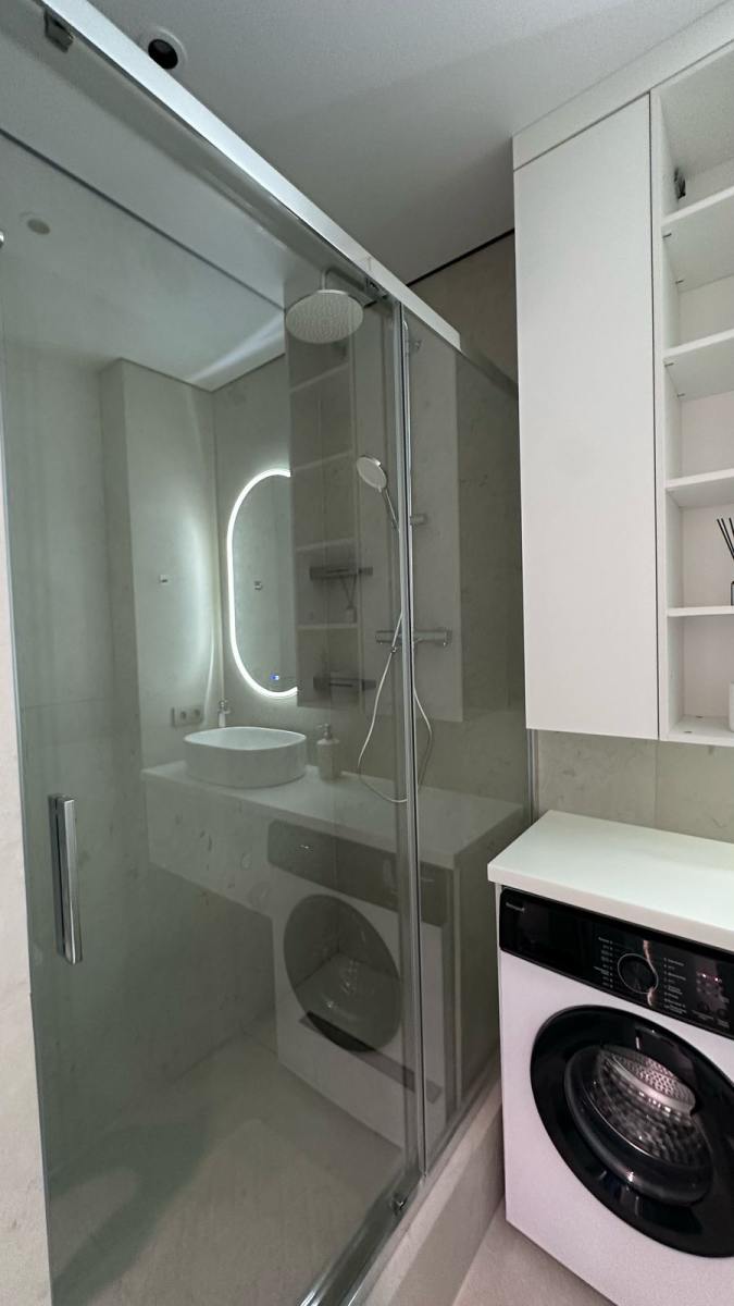 Санузел 3,7 м² оформлен в стиле премиальных бутиковых отелей — тёплые поверхности, аккуратная световая геометрия, интегрированная система хранения и корректная вентиляция.