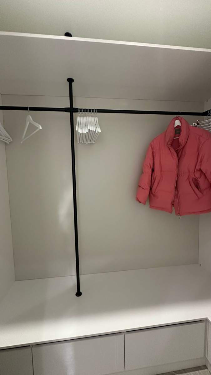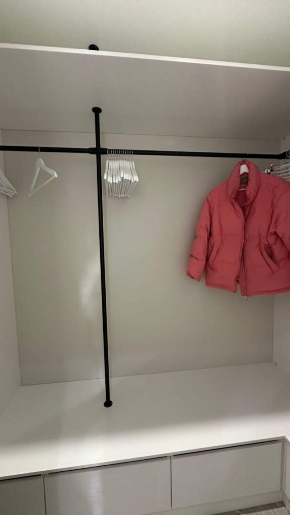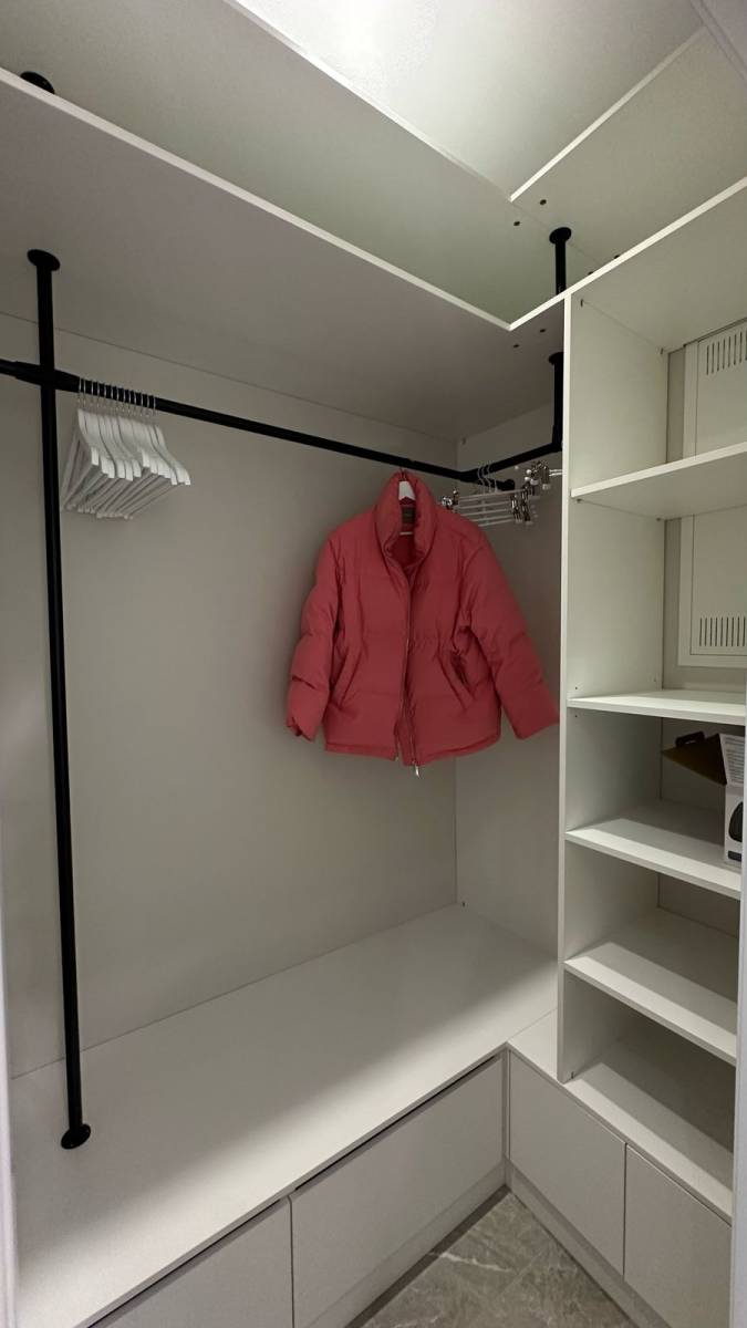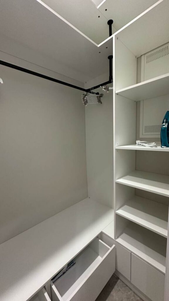 Гардероб 2,76 м² стал продуманной системой хранения: скрытая подсветка, ниши, удобное размещение обуви, чемоданов и повседневных вещей.