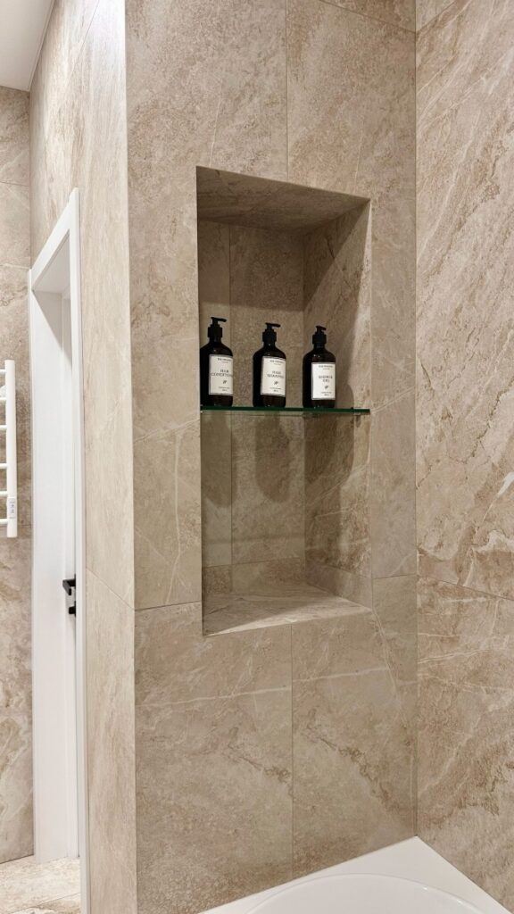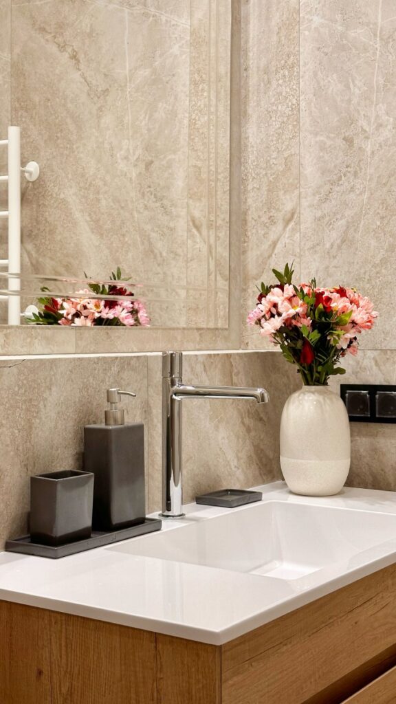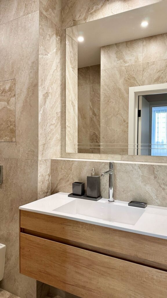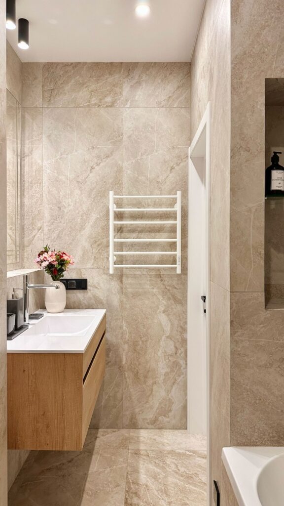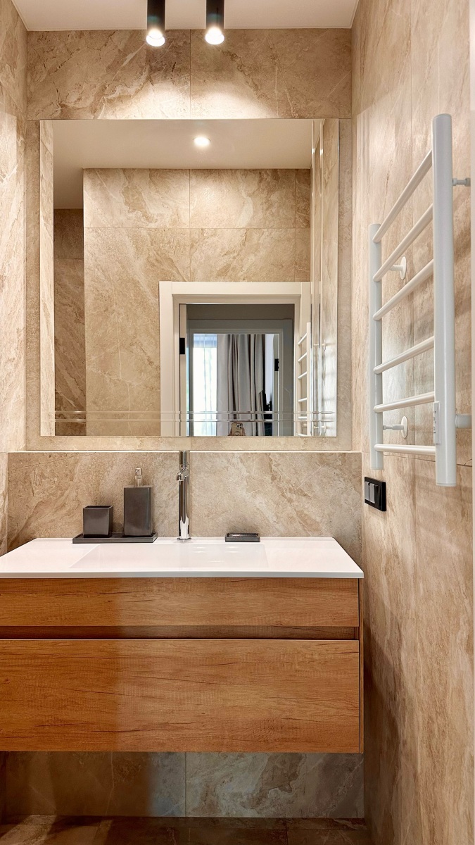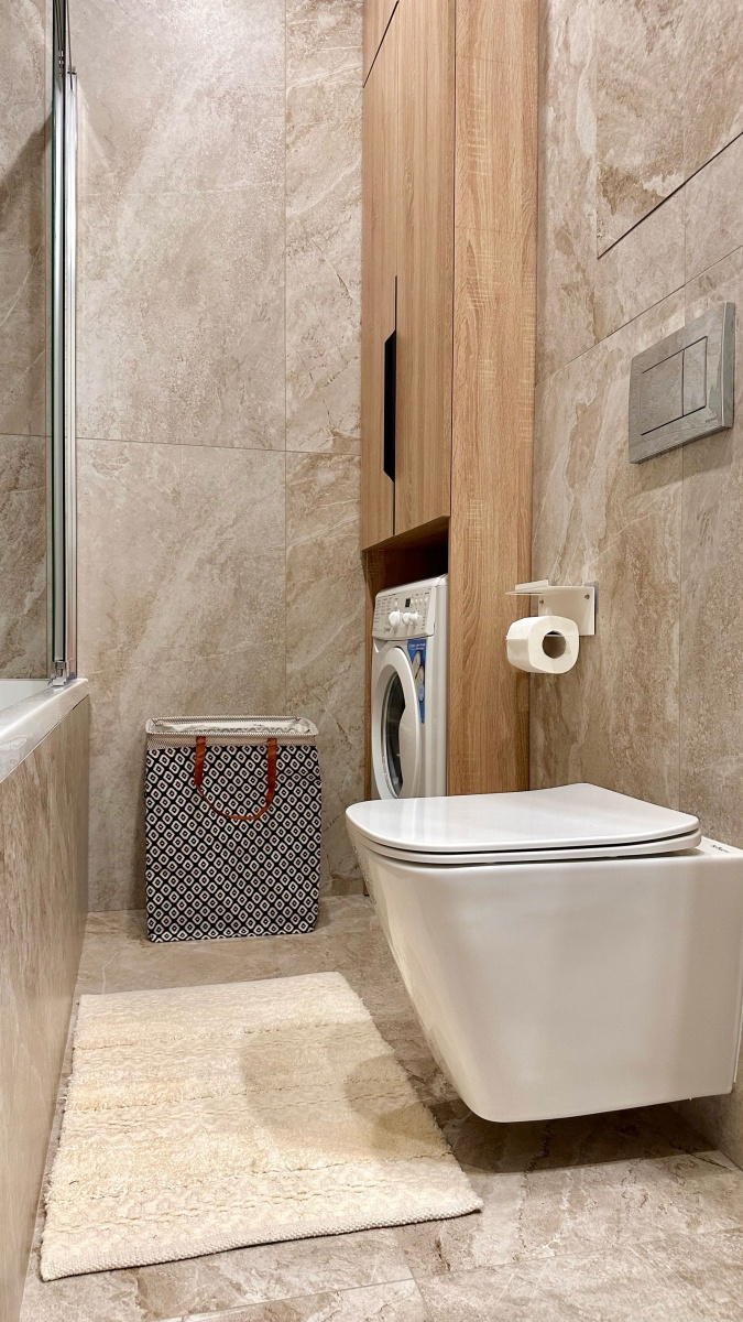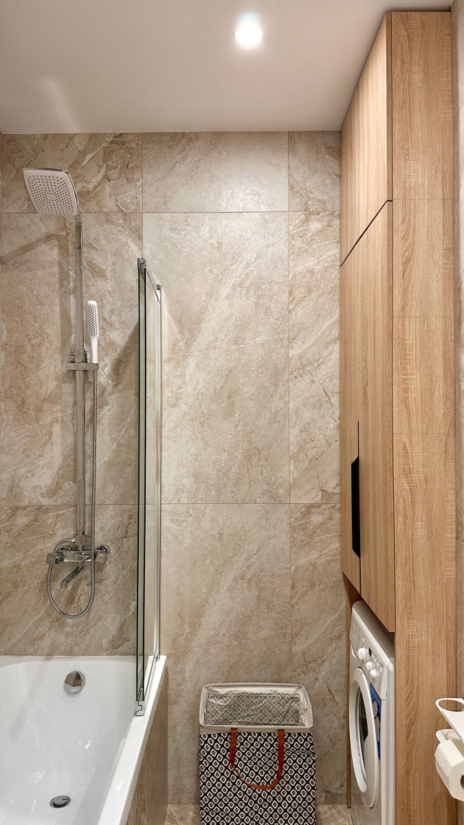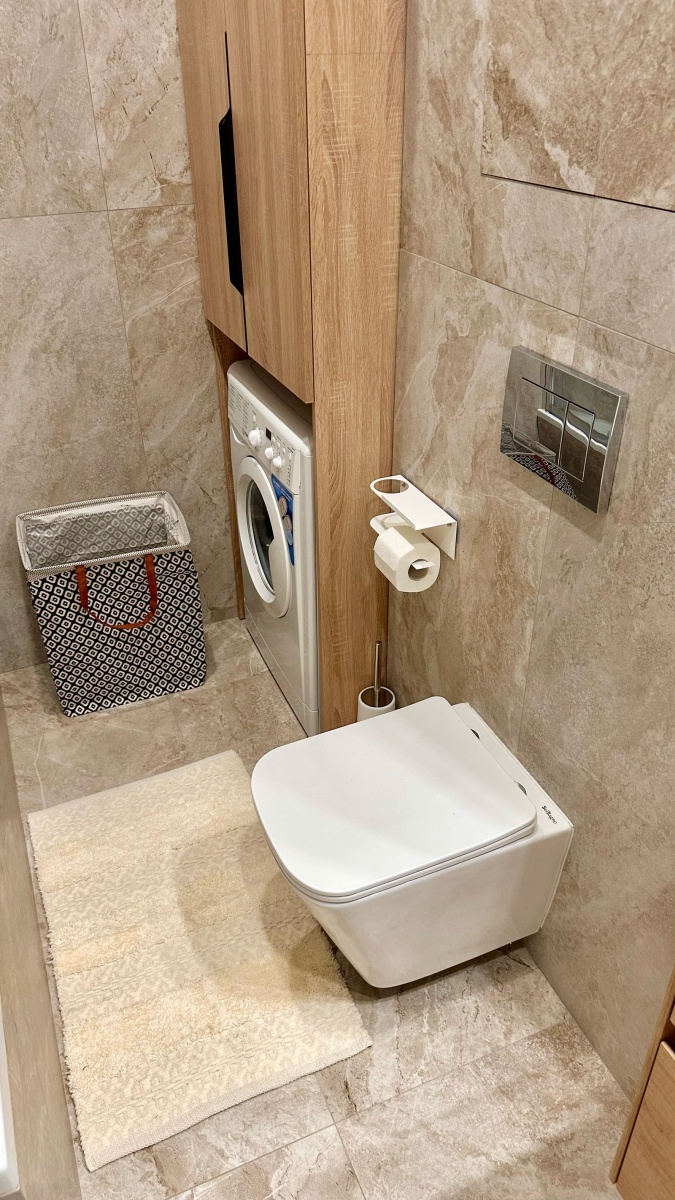 Санузел 4,2 м² уровня 5* — тёплые поверхности, мягкий свет, вытяжка и резерв защиты, удобно расположенная бытовая техника (стиралка + сушка) без ощущения тесноты. Такой санузел увеличивает привлекательность объекта и снижает эксплуатационные риски.