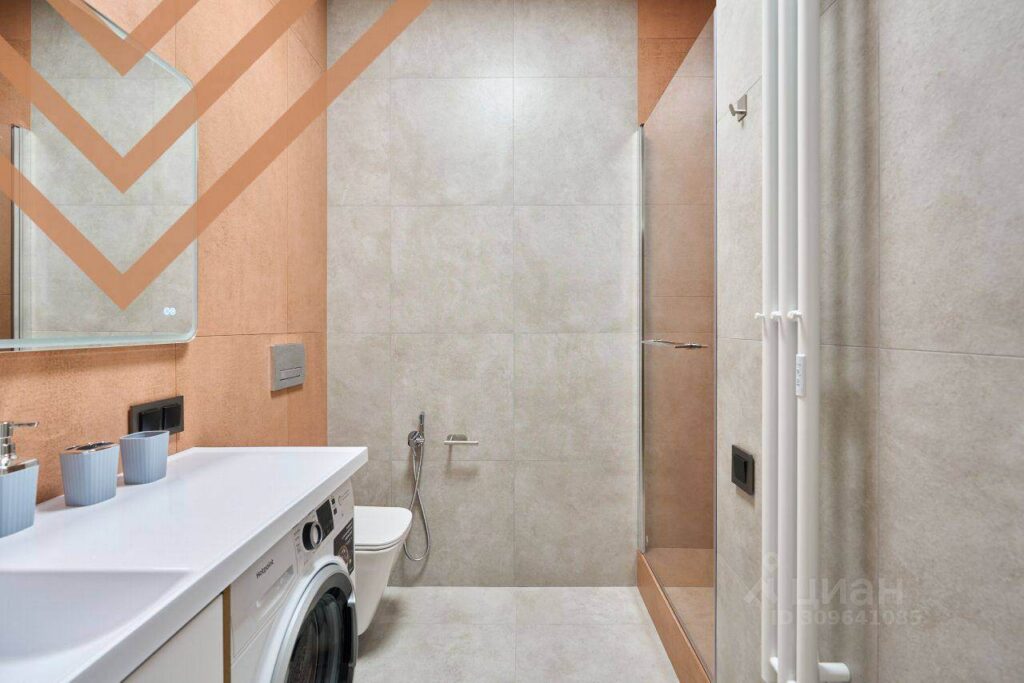 Санузел 4,5 м² с ванной — полноценная ванная, важное решение для семьи с ребёнком. Эргономика и хранение продуманы для максимального удобства.