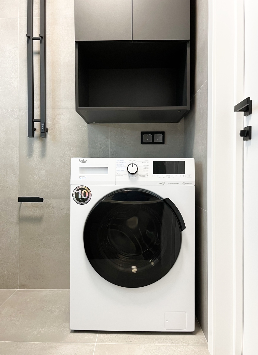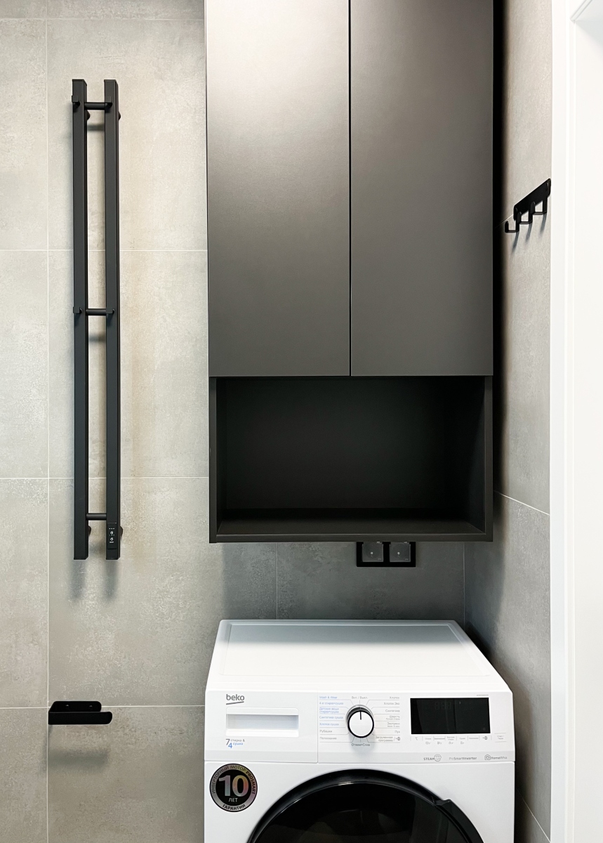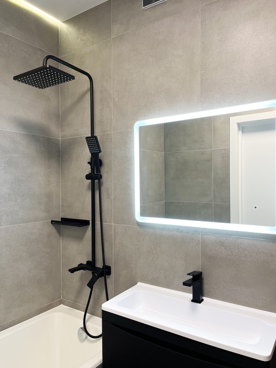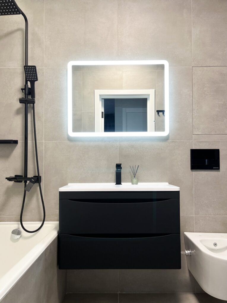 Санузел 4,5 м² с ванной — компактно, но премиально. Редкость для малой площади, выполнено без компромиссов: ниши хранения, удобная посадка ванны, тёплый свет.
