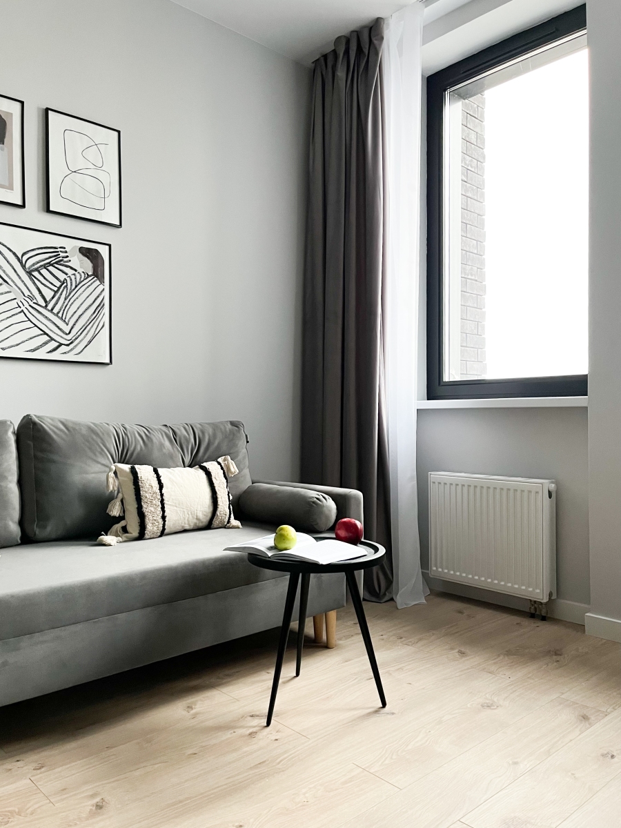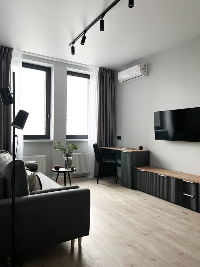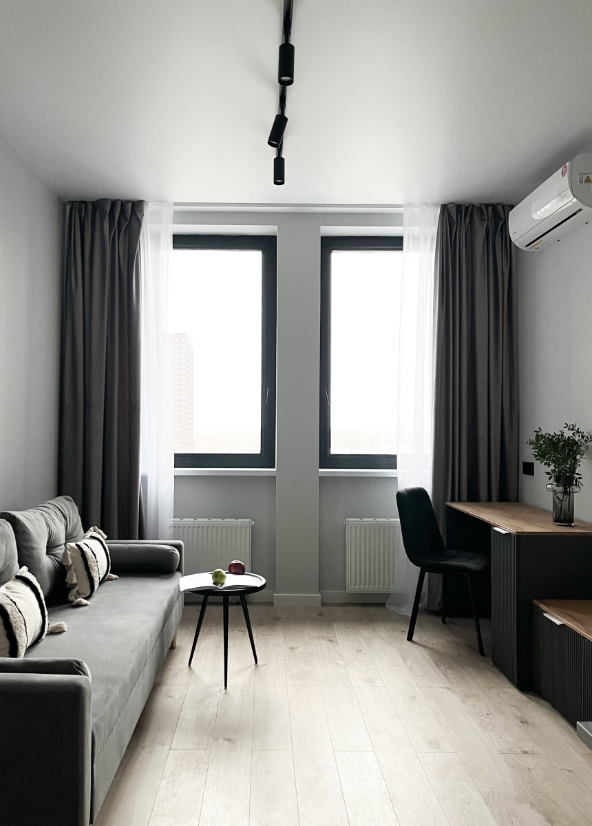 SMART HOME создала пространство, где планировка, свет, хранение и мебель работают как единая инженерная система, позволяющая площади ощущаться объёмно, удобно и эмоционально привлекательно для арендатора. Вид на зелёный внутренний двор усиливает ощущение приватности и стабильности — важный фактор для семейных арендаторов.