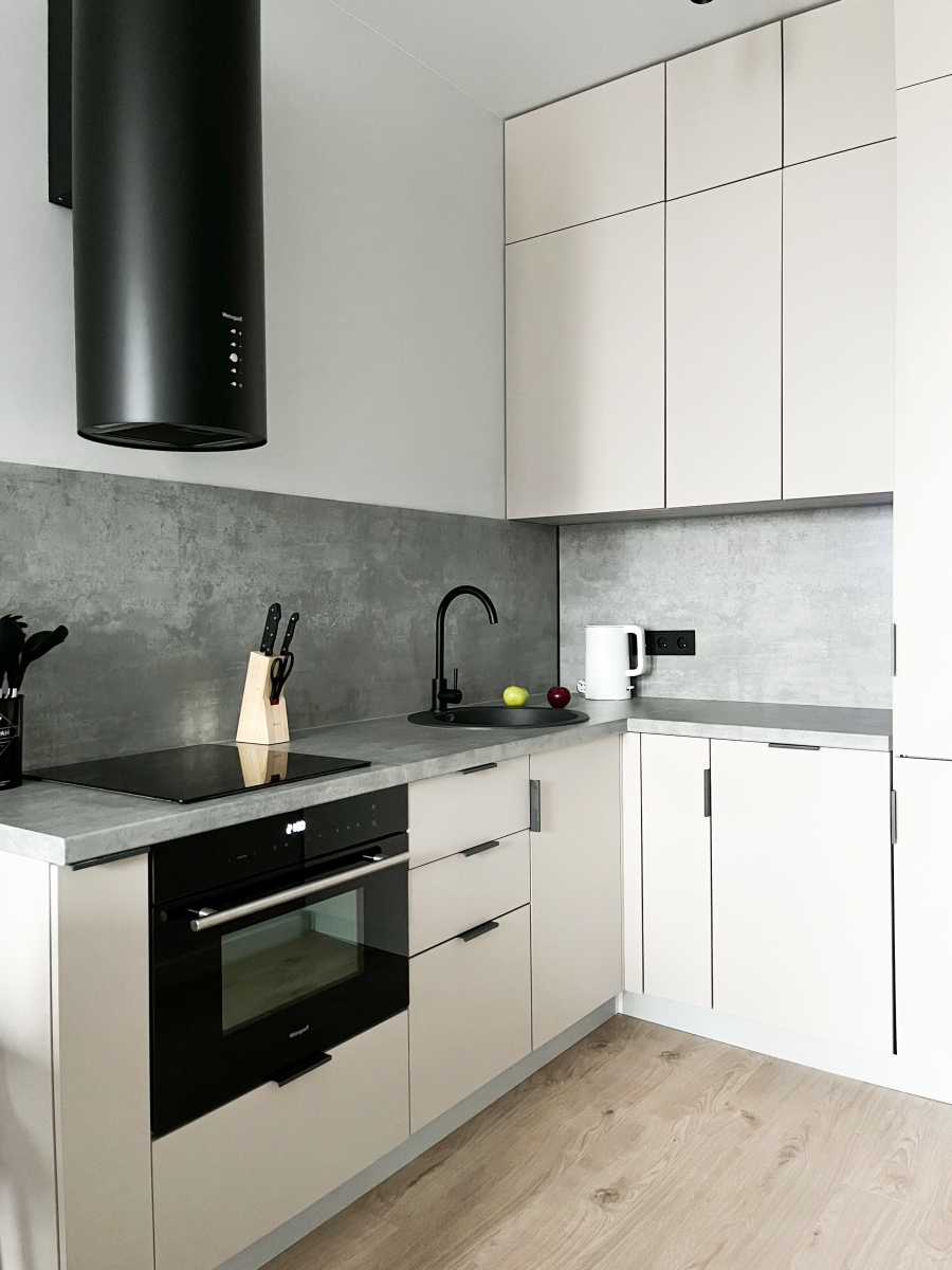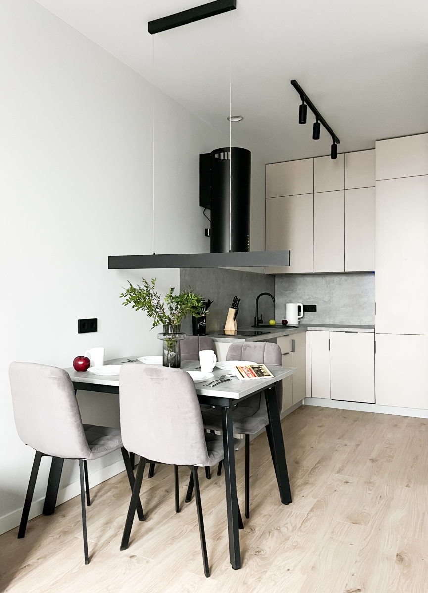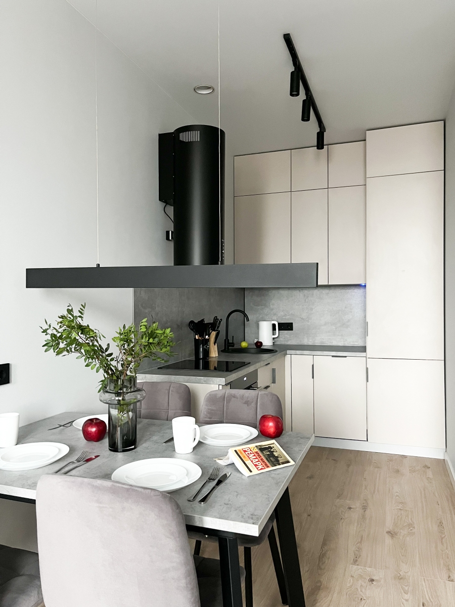 Кухня-столовая-гостиная 15,5 м² — главный аргумент при сдаче. Три сценария в одной зоне: функциональная кухня со скрытым хранением, столовая зона и мягкая зона отдыха. Лёгкий модерн, свет со сценариями и минимум визуального веса создают эффект увеличенной площади.