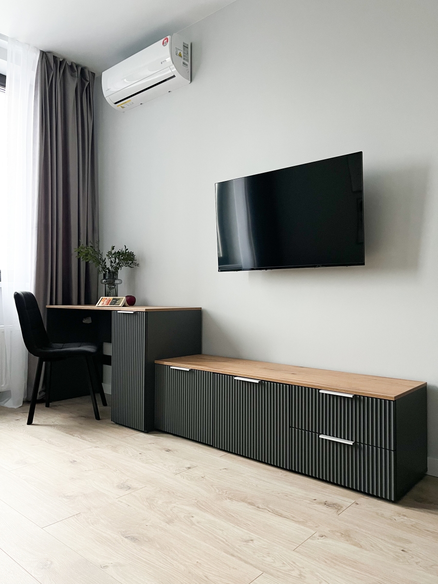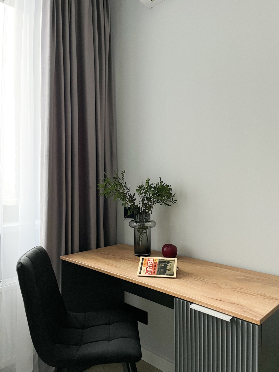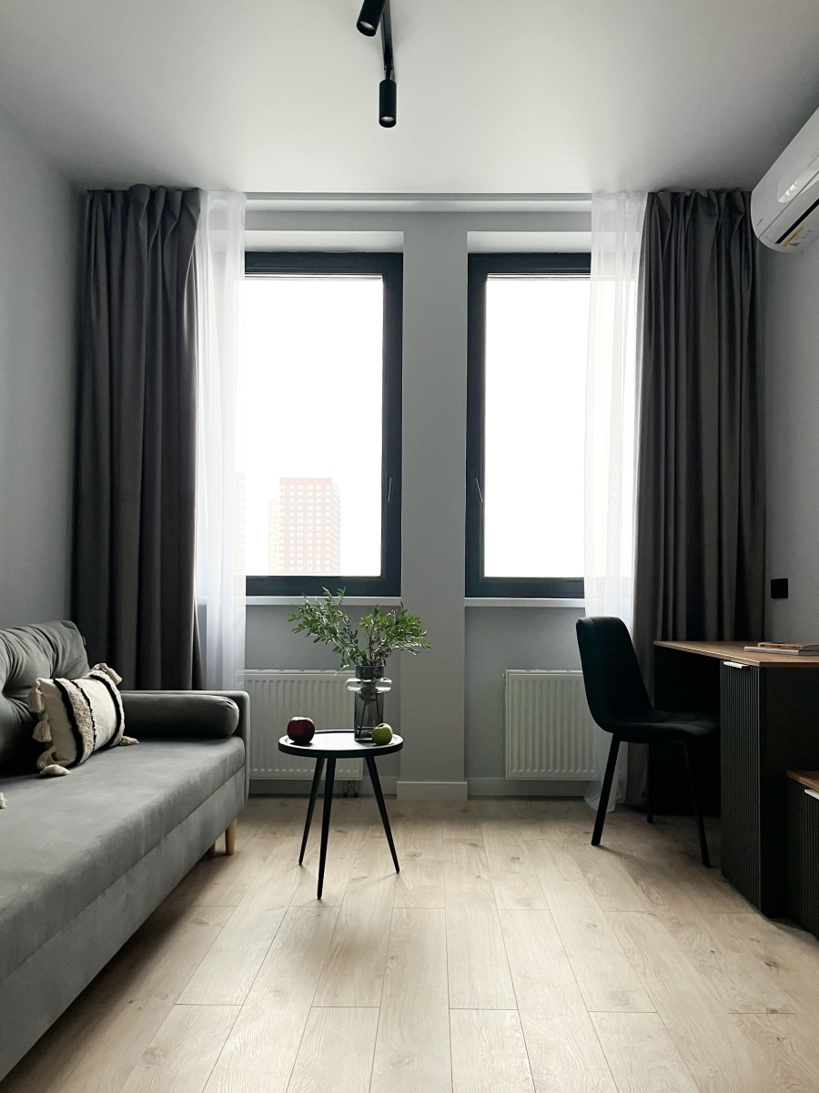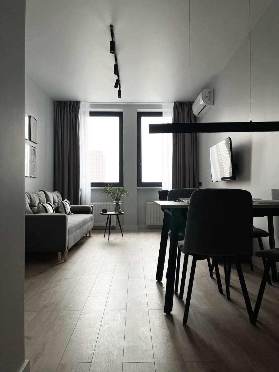 Стиль лёгкого модерна — эмоциональная привлекательность. Чистые линии, мягкие фактуры, спокойная палитра. Интерьер, который нравится большинству арендаторов и не устаревает. Световые сценарии усиливают атмосферу: верхний, мягкий вечерний, акцентный, ночной.